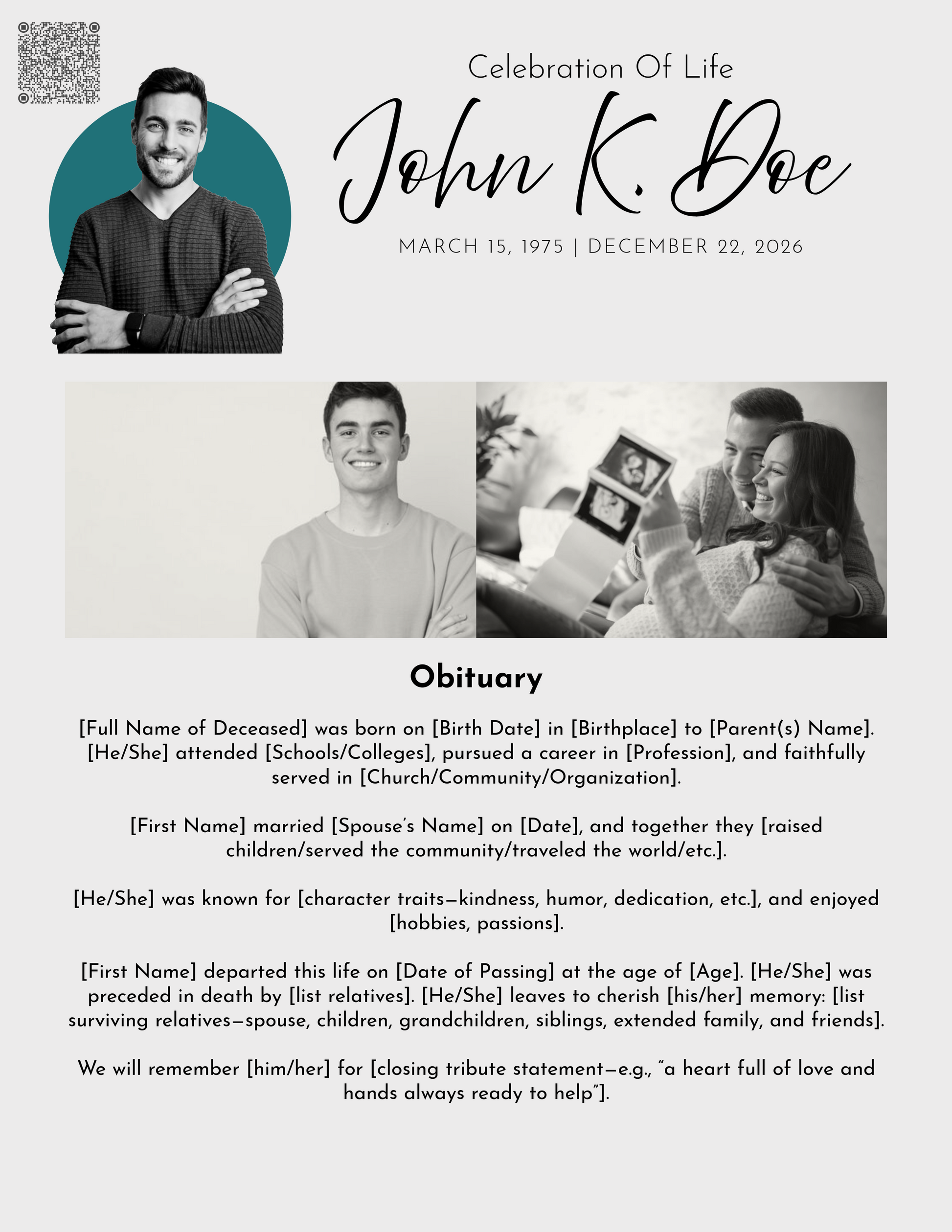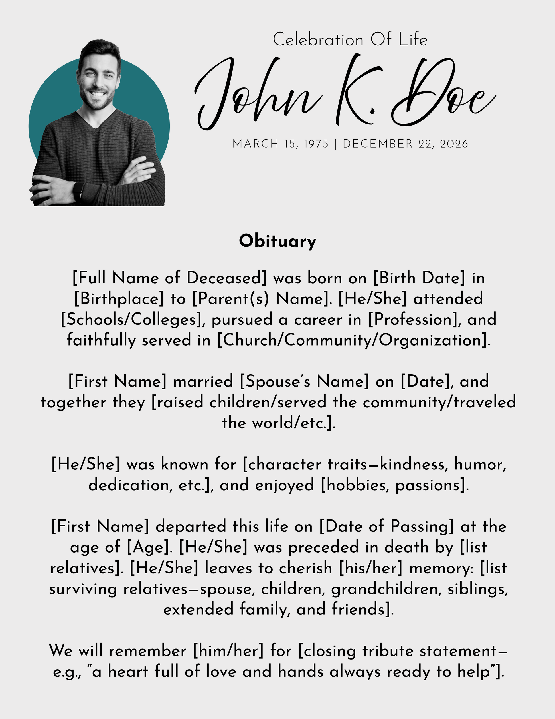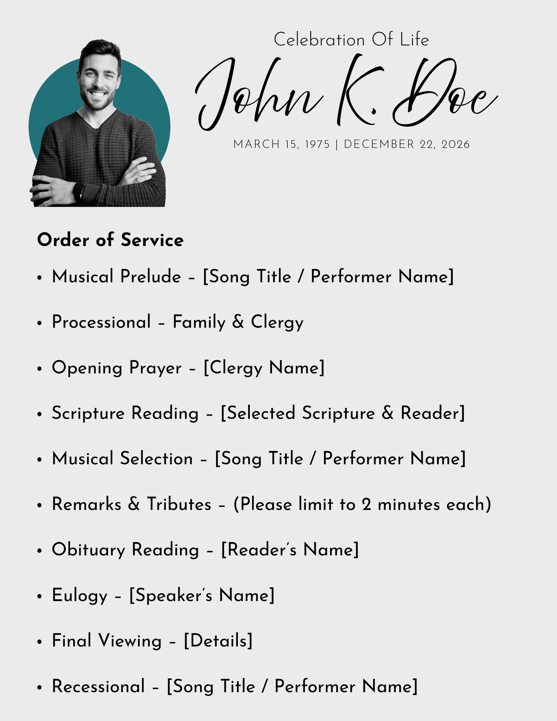Includes: Name, dates, short obituary, scripture/quotes, and service order
